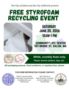 Salem and Beverly partner once again to host Styrofoam Collection Day on Saturday, June 20, 2026, from 10:00am – 1:00pm. Hold on to your foam, as Casella (formerly Save that Stuff) will collect it to recycle! This is a drive-through event at the Community Life Center, 401 Bridge St, Salem, MA. Residents of Salem and Beverly may participate.